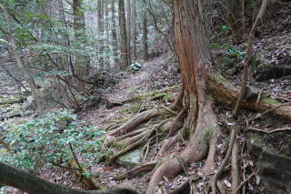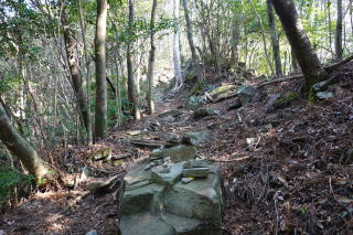 山の神様が宿っているようで、祠に向かってお参りした後、先へ進むと、道は急に細くなり、本格的な山道へと変わっていった。 |