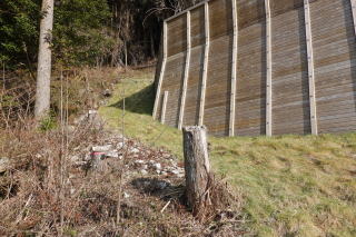 左手にそびえる大きな砂防提の脇に、赤い布がちらりと見えた。