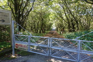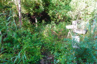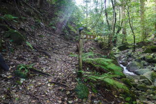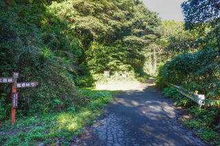 舗装された道を歩くとやがて通行止めの棒があり、案内板に従って藪道に入った。 |